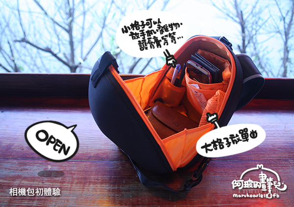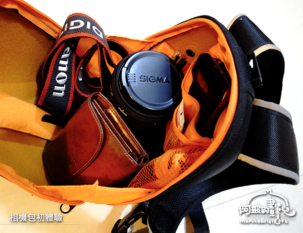 主要空間是拿來擺放單眼相機(一機一鏡)稍微測試一下短鏡頭比較ok,長鏡頭有點困難了,但因為不是特地出門外拍,只是希望可以「遊玩的時候隨拿隨拍」,因此這個包包是剛剛好的~另外包包側邊都可以貼裡頭附上的魔鬼氈口袋,用來放手機、鏡子、錢包、護唇膏之類的,這樣我就不用再提一個包包出門啦!完全達到簡便行動的目的!