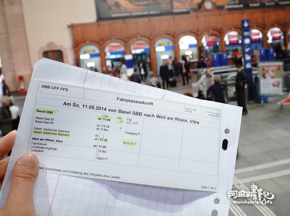 我們抵達車站之後,因為要再轉車才能夠抵達 Vitra Design Museum,所以就一如往常地走到Info櫃檯詢問,出來的服務內容讓我們讚嘆不已!因為它不只把可以搭乘的車號列出,也將轉程的月台、乘車時間等等都詳盡列出,然後印給我們。這對於自助旅行的人來說,簡直是完美的服務(緊抱)外加給予100分!