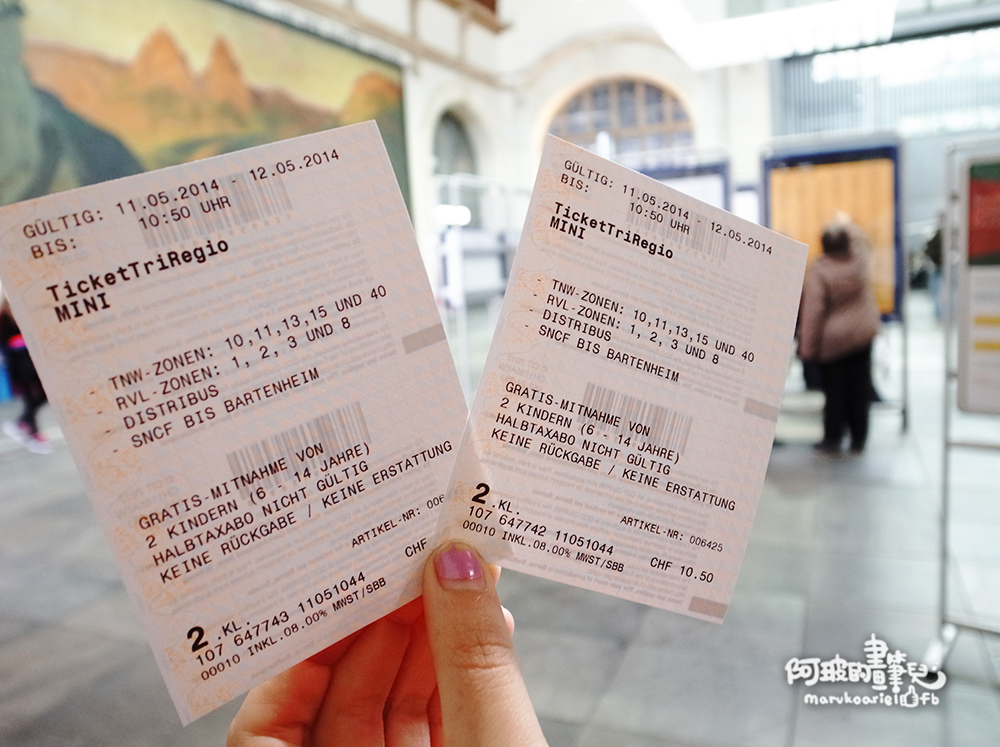 *這裡要再次提到,購買火車票時,儘量走到櫃檯跟服務人員購買,因為這樣將可以買到各式各樣的優惠票~絕對不會吃虧:)例如這次前往Basel買到的是Group ticket--票價為 €35.1,可找至多5人share的票種--不限時間,不限班次,且包含來回!如果找到5個人一起搭火車的話,每人來回只要 €7.02。就算是只有兩個人搭,來回也只要 €17.52!若是用機器購買,光是單趟的車票最低也要 €18.9 是不是差很多~